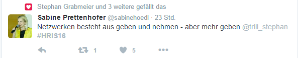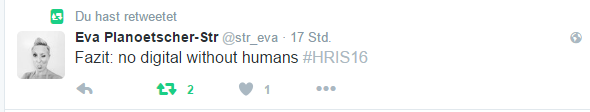 Stress, weil ich natürlich fleißig mitgeschrieben (bin ja meinen Leserinnen hier verpflichtet), getwittert #HRIS, fotografiert und auch am 2. Nachmittag noch den richtigen Raum für den nächsten Programmpunkt gesucht habe ;-). Ach ja und noch was: ich hatte auch Spaß. Ein „Arbeits-Event“, der auch Spaß gemacht hat, Herz was willst du mehr!